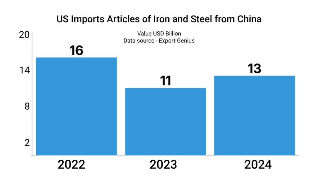 Tariffs raise the cost of imported goods. For example, a 25% tariff on articles of iron and steel from China means American companies must pay 25% more for that imported steel.